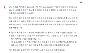 대화형 AI 의 장점은 검색할 필요 없이 물어보면 된다는 것입니다. 그래서 구글 Gemini 에게 스스로에 대해 직접 물었습니다.
