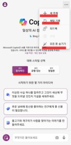 코파일럿 앱이 설치되었다면 실행하고 채팅창에 그리고 싶은 이미지를 텍스트로 입력하면 됩니다. 그림과 같이 오른쪽 메뉴에서 ‘새 주제’ 또는 ‘채팅 기록’,’모든 톤 숨기기’ 메뉴를 볼 수 있습니다. 컴퓨터 화면에서도 메뉴는 똑같습니다.